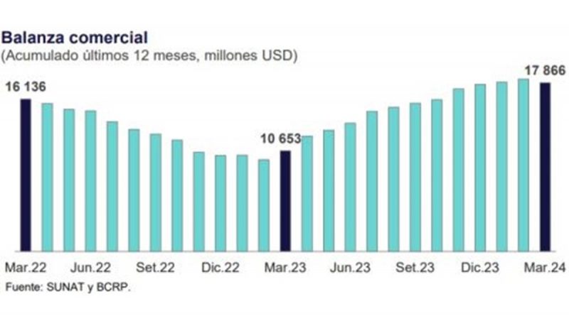 La balanza comercial acumulada en los últimos doce meses a marzo del 2024 alcanzó un superávit de 17,866 millones de dólares, según el último Resumen Informativo Semanal del Banco Central de Reserva (BCR).