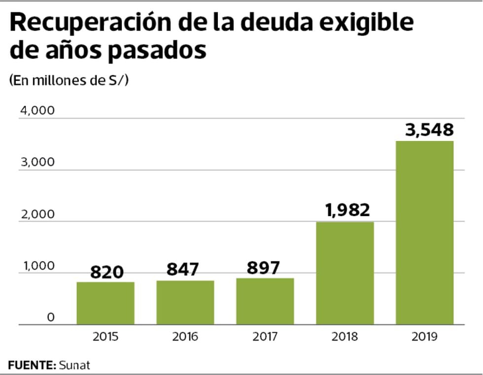 Por otro lado, deja conocer que en el 2019 se pudieron recuperar S/ 3,548 millones de “stock de la deuda exigible”, es decir, la deuda pendiente de cobro proveniente del 2018.