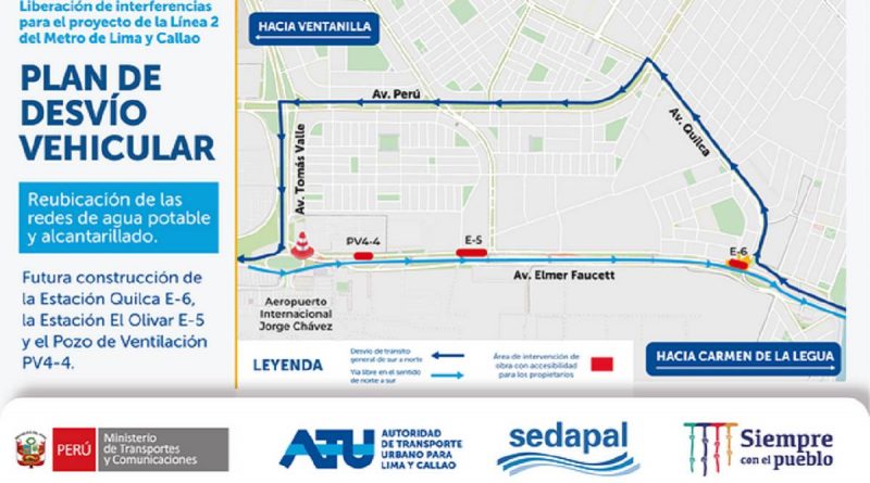 A fin de continuar con la construcción de la Línea 2 Ramal 4 del Metro de Lima y Callao, el Ministerio de Transportes y Comunicaciones (MTC) y la Autoridad de Transporte Urbano para Lima y Callao (ATU) informó que el 30 de enero se pondrá en marcha un plan de desvío vehicular en la avenida Elmer Faucett debido a los trabajos de reubicación de redes de agua potable y alcantarillado a cargo de la empresa Sedapal con una duración de 45 días.