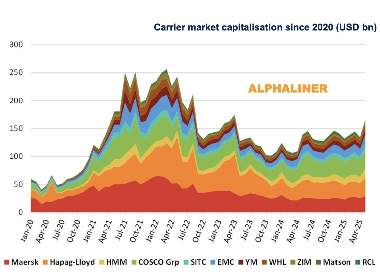 El transporte marítimo de contenedores ha cobrado popularidad entre los inversores en las últimas semanas debido al aumento de las tarifas de flete a raíz de la guerra comercial. Alphaliner informó que, el mes pasado, ya había seis transportistas cotizados oficialmente considerados de gran capitalización, con valoraciones de mercado superiores a los 10 000 millones de dólares. Wan Hai, de Taiwán, es la última en unirse a las grandes empresas.