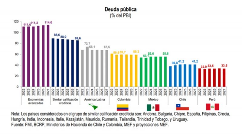 La economía peruana sigue siendo una de las economías más sólidas de la región. Sus fortalezas se ven reflejadas en una tasa de inflación decreciente que ya se encuentra dentro del rango meta en abril (2.42% últimos 12 meses) y en niveles de déficit fiscal y deuda pública que se ubican entre los más bajos de las economías emergentes al 2023 y para los próximos años.
