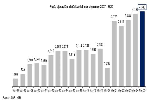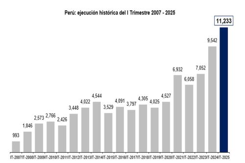 En el primer trimestre del 2025 la inversión pública experimentó un crecimiento de 18%, en comparación con el mismo período del año pasado, y alcanzó una ejecución histórica de 11,233 millones de soles, informó hoy el Ministerio de Economía y Finanzas (MEF).