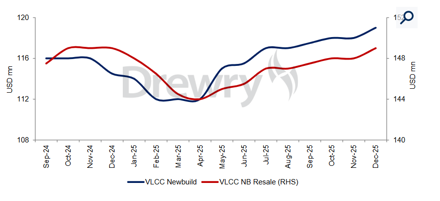 Las empresas están aprovechando los elevados precios de los buques de segunda mano desinvirtiendo en tonelaje más antiguo en un contexto de regulaciones ESG más estrictas, a la vez que redistribuyen el efectivo proveniente de la venta de buques, junto con una sólida liquidez operativa, hacia buques más nuevos y de mayor eficiencia energética. El valor de los VLCC de segunda mano ha ido en aumento desde el segundo semestre de 2025. El valor de los VLCC de nueva construcción y de reventa de nueva construcción aumentó alrededor de un 1,0 % en los últimos tres meses, mientras que los precios de los petroleros VLCC de 5 y 10 años de antigüedad aumentaron un 1,3 % y un 1,7 %, respectivamente. El mayor aumento se registró en los VLCC de 15 años de antigüedad, cuyo valor subió un 3,4 % en los últimos tres meses.
