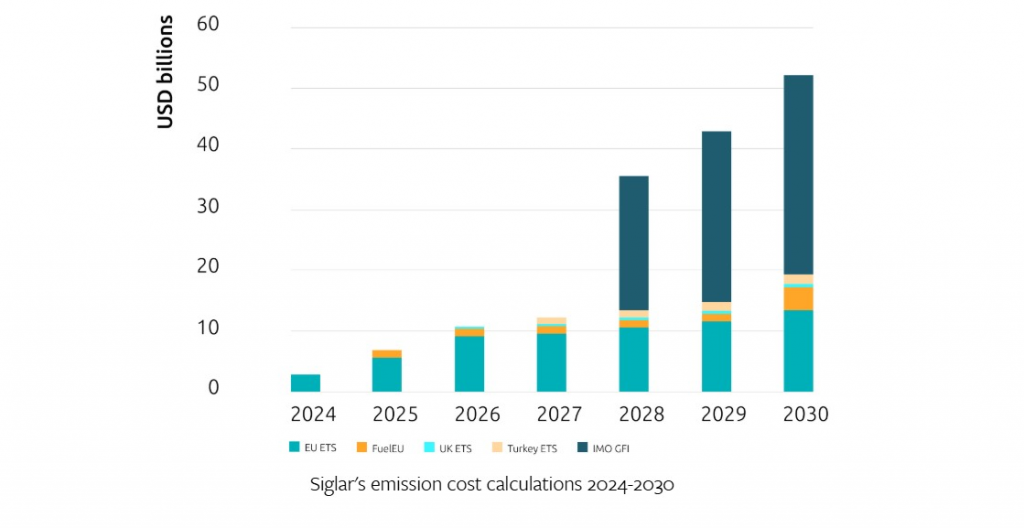El total incluye medidas superpuestas como el ETS de la UE, FuelEU Maritime, el ETS del Reino Unido y la próxima medida de intensidad de combustible de gases de efecto invernadero (GFI) de la OMI, que entrará en vigor a partir de 2028.