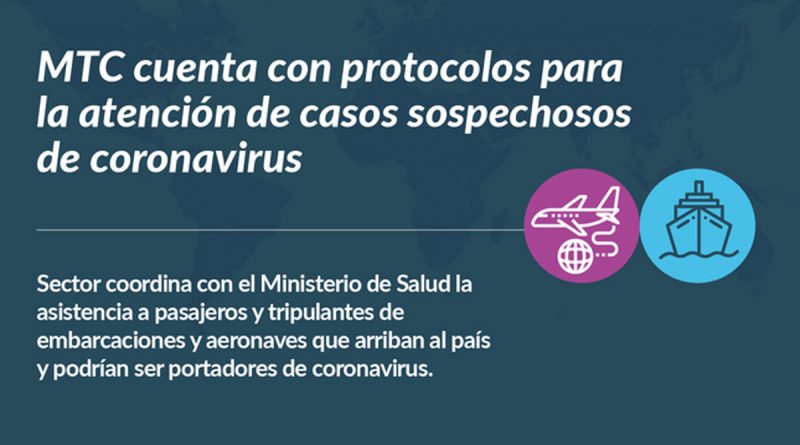 El Ministerio de Transportes y Comunicaciones (MTC), a través de sus entidades la Autoridad Portuaria Nacional (APN) y la Dirección General de Aeronáutica Civil (DGAC), emplea protocolos para la atención de pasajeros y tripulantes sospechosos de portar coronavirus. Durante la aplicación de los procedimientos, el sector articula acciones con el Ministerio de Salud (Minsa) para asistir a los posibles infectados de manera inmediata.