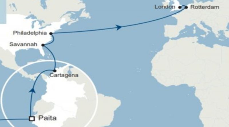 Con inicio en Tauranga, Nueva Zelandia, luego de recalar a Paita, el servicio cruza el Canal de Panamá, visita Cartagena, Colombia (cinco días después), y Savannah, Georgia (10 días), antes de los tres destinos finales en el norte de EE.UU. y Europa, con arribo a Países Bajos en 25 días.