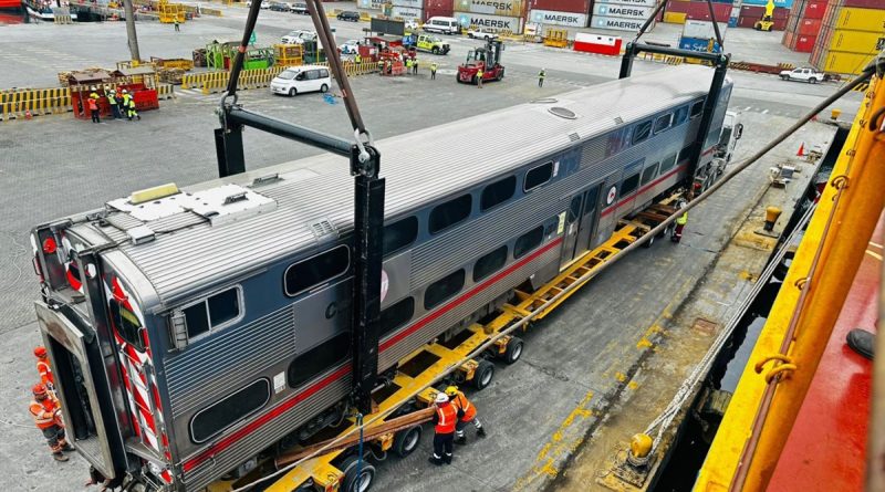 La Municipalidad Metropolitana de Lima (MML) inició el desembarco del primer lote de 43 coches y 11 locomotoras, donados por la empresa estadounidense Caltrain, en el puerto del Callao, como parte del proyecto del Tren de Cercanías Lima–Chosica.